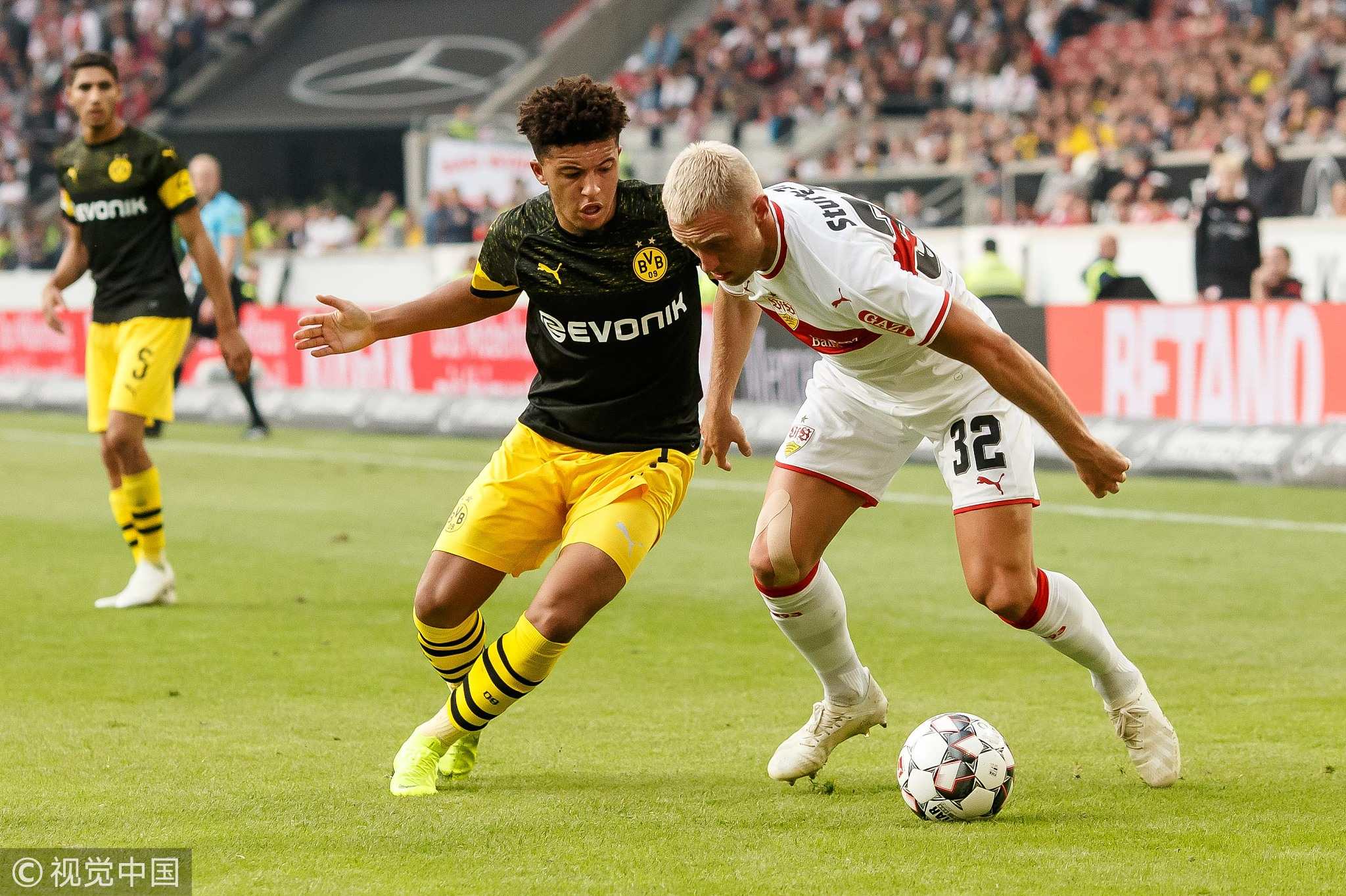 Jadon Sancho of Borussia Dortmund (L) and Andreas Beck of VfB Stuttgart (R) battle for the ball during the match between the two teams in the Bundesliga at Mercedes-Benz Arena, Stuttgart, Germany, October 20, 2018. /VCG Photo