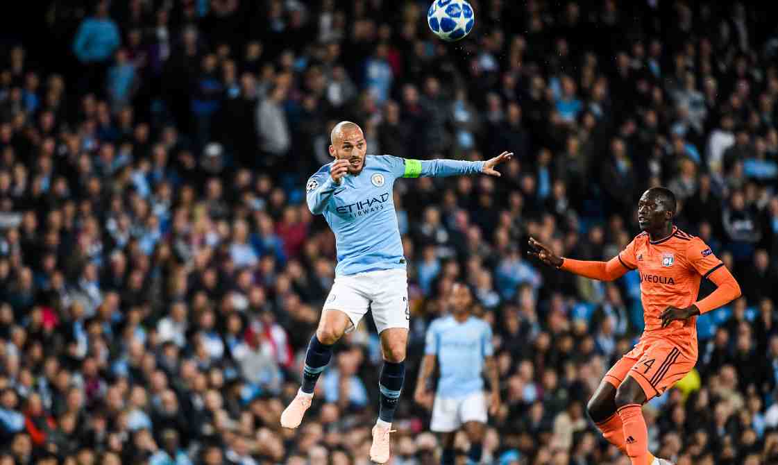 David Silva (L) and Pape Cheikh during the Champions League match between Manchester City and Lyon at Etihad Stadium on September 19. /VCG Photo