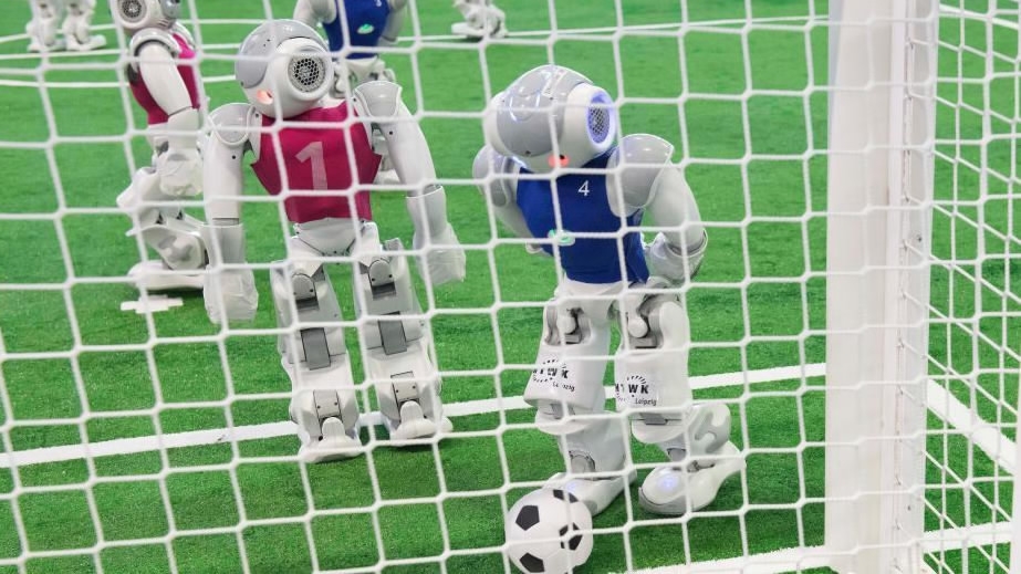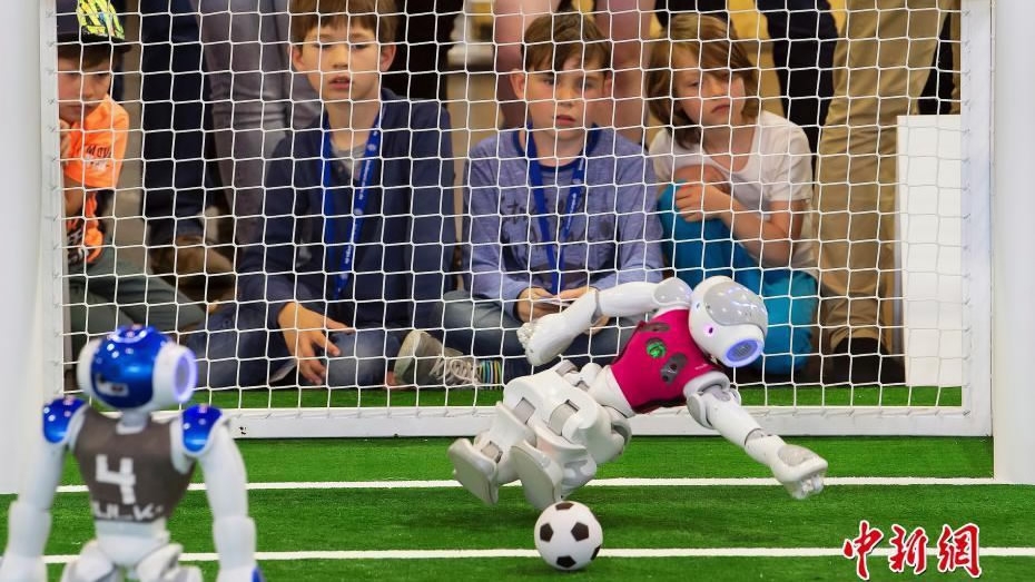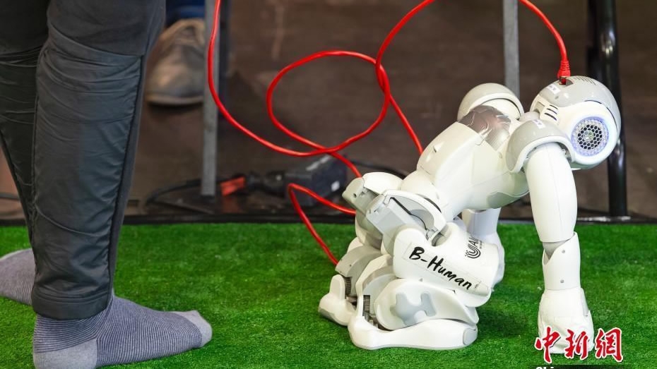 NAO, the humanoid robots used in the games were equipped with up to 25 actuated joints. In its head, two cameras were integrated for perceiving the environment. In its chest, sonar sensors were used to measure distances. Extra sensors were built in the robots’ feet to measure ground contact and the contact with the ball. /Chinanews Photo