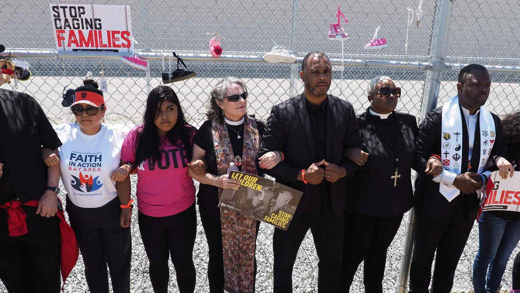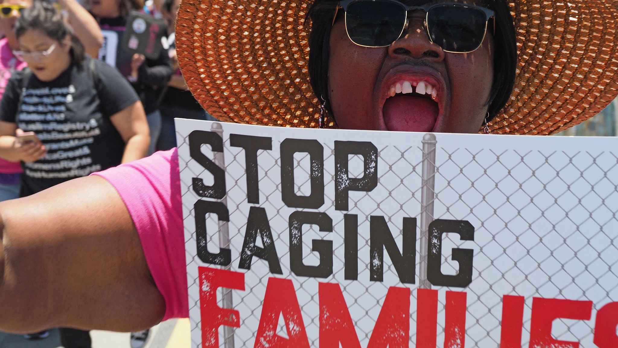 Protesters with signboards reading “Stop caging families” stood before a fence onto which some children’s shoes and keys were tied after their march while some were seen holding a piece of barbed wire in front of their face as a way to protest against the policy. /VCG Photo