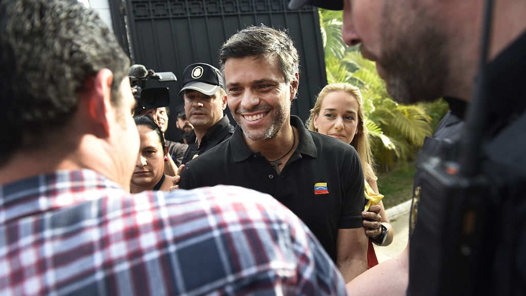 Opposition leader Leopoldo Lopez (C) speaks to members of the media outside of the Spanish ambassador's residence, Caracas, Venezuela, May 2, 2019. /VCG Photo