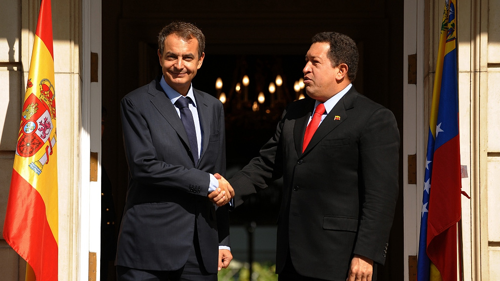 Then Spain's former prime minister Jose Luis Rodriguez Zapatero (L) greets Venezuela's then president Hugo Chavez upon his arrival, La Moncloa Palace, Madrid, Spain, September 11, 2009. /VCG Photo.