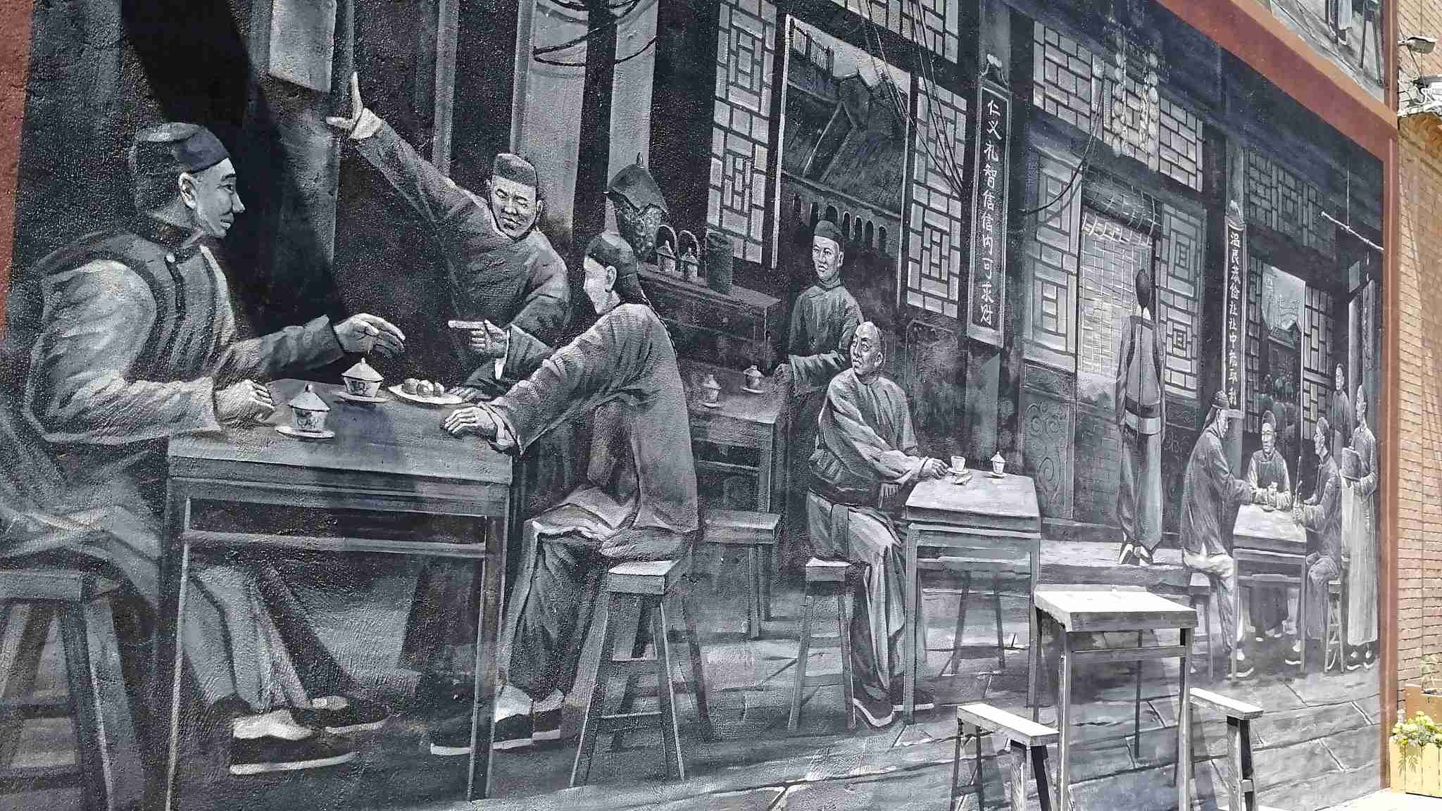 The 92 square-meter art piece features two floors of crowds sitting around tea tables wearing traditional gowns and long braids. It celebrates the heritage of the unique establishment of the teahouse, where people gather to chat, socialize, or enjoy entertainment as they sip a cup of tea. /VCG Photo