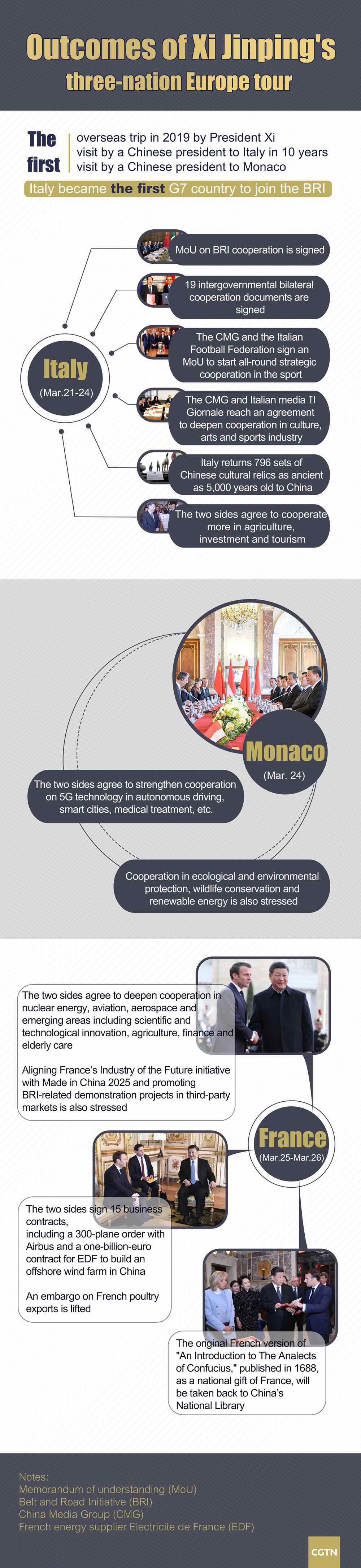 Both Italy and France are comprehensive strategic partners of China, and Monaco is one of the friendliest Western countries towards China, Wang said, adding that the president's first overseas trip this year brought Chinese ties with the three countries to a new high.