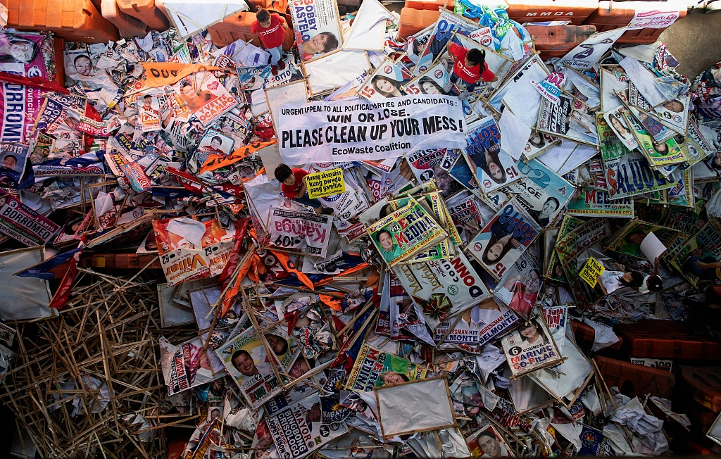 The image was captured by a photographer on Tuesday to show an environmental activist (wearing red t-shirts) stand on campaign materials, which discarded by people who run for elective posts and the general public. He was calling on people to conduct a post-election cleanup activity in Manila, the Philippines. /VCG Photo