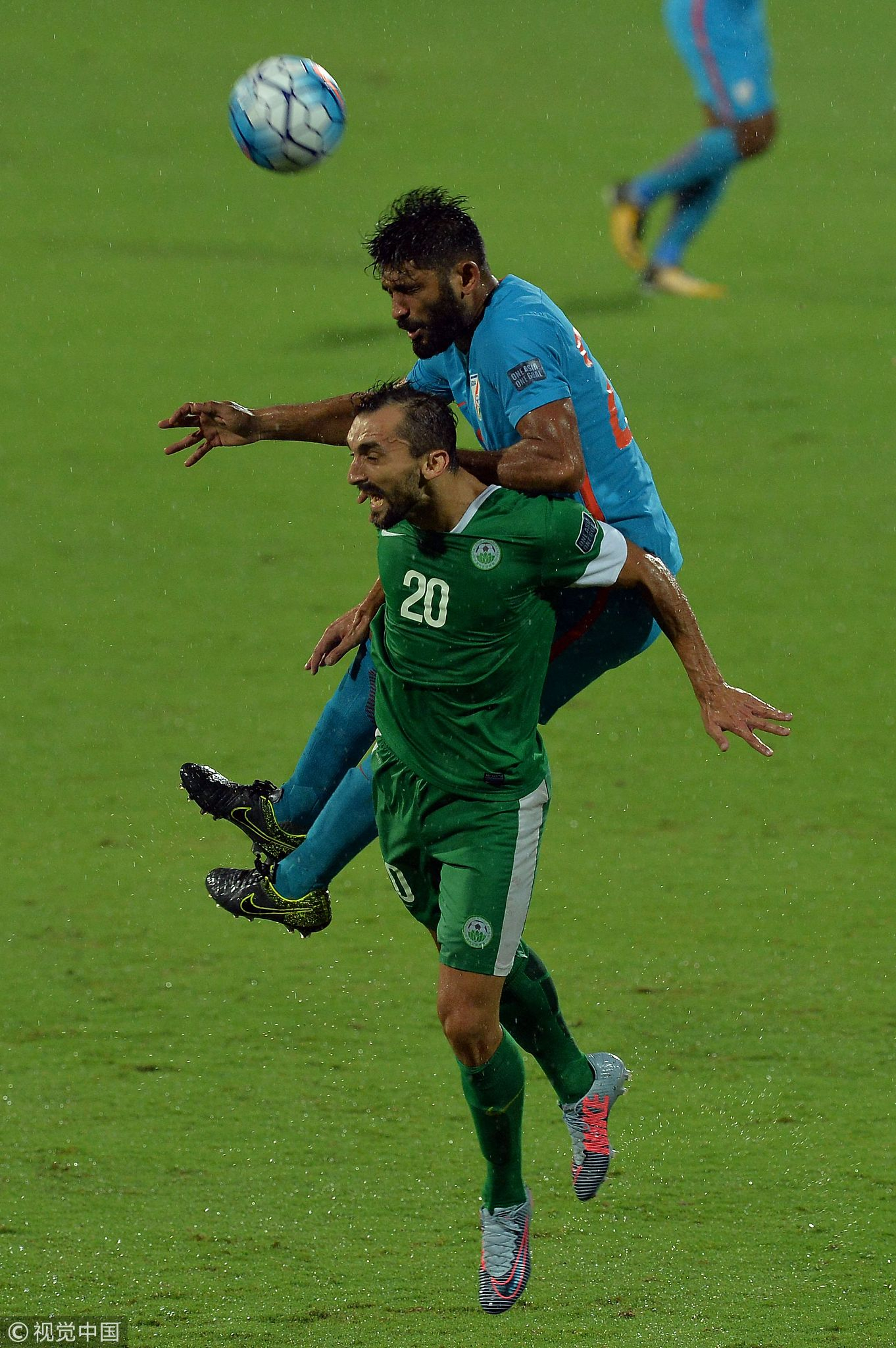 India's Balwant Singh (Top R) and Carlos Leonel Fernandes (C) head the ball during the 2019 AFC Asian Cup qualifying match between India and Macao at the Kanteerava Stadium, Bangalore, October 11, 2017. /VCG Photo