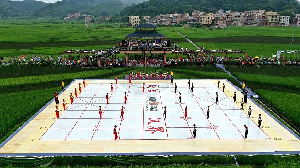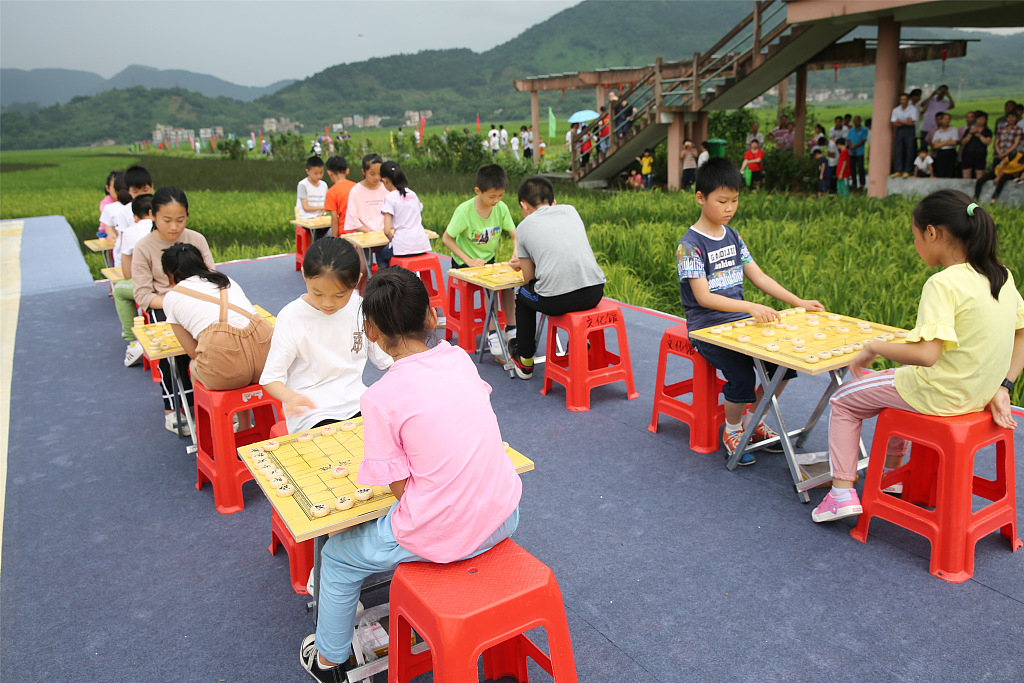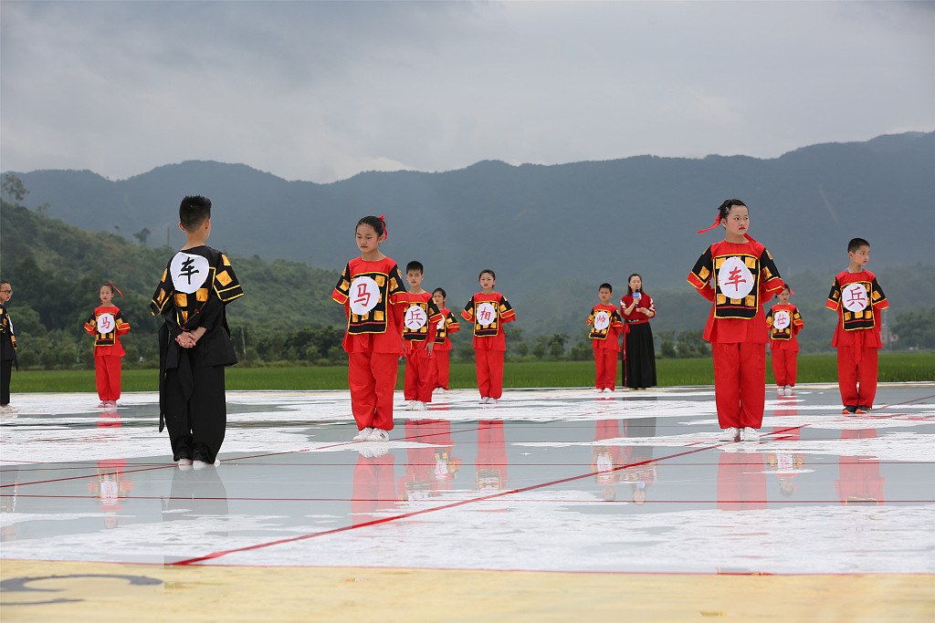 Two of the world’s best Chinese chess players, Wen Jing and her husband Xu Yinchuan gave instructions in an ancient local region's dialect to the children to move as chess pieces, offering a brand new experience to audiences at the scene. /VCG Photo