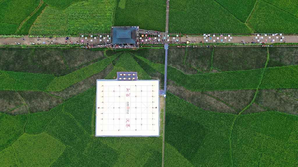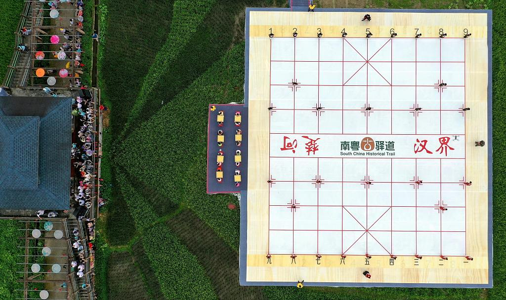 A giant-sized Chinese chess, also known as Xiangqi game, featuring 32 children playing the role of chess pieces on a piece of land as the chessboard, was held at Yulongzhai tourist attraction in Zhaoqing City, south China’s Guangdong Province last Sunday. /VCG Photo