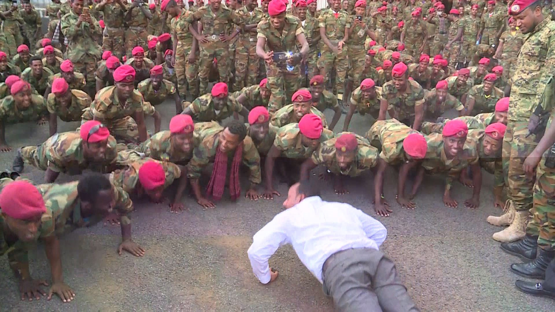 Ethiopian Prime Minister Abiy Ahmed did push-ups with dozens of protesting soldiers in Addis Ababa on October 10. They were among several hundred who had marched into his office to demand better pay. Ahmed was unhappy that soldiers had brought weapons and ordered them to do 10 push-ups.