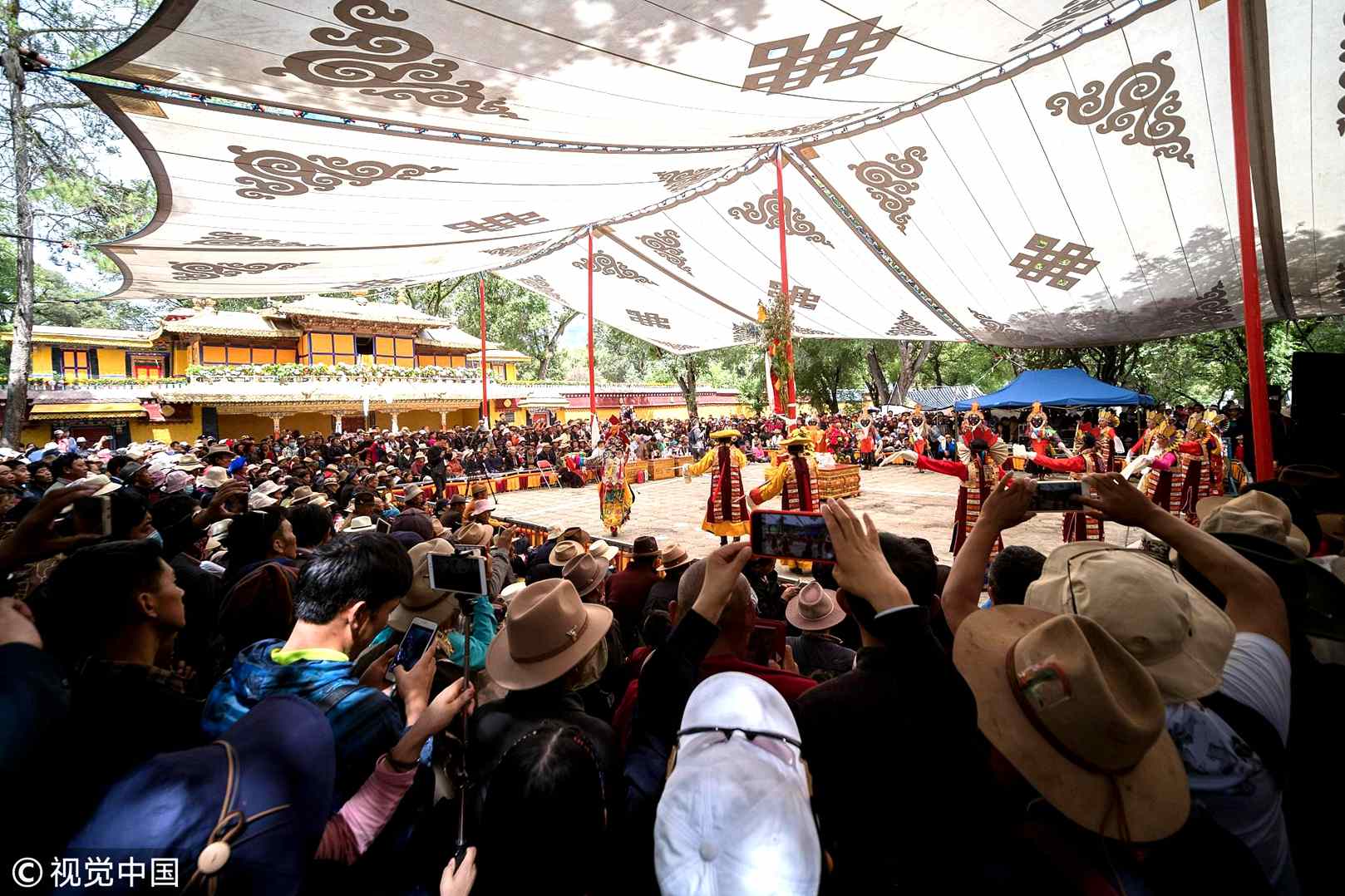 Thousands of domestic and foreign tourists come to watch the Tibetan Opera performances at the Drepung Monastery every year during the Shoton Festival, August 12, 2018. /VCG Photo