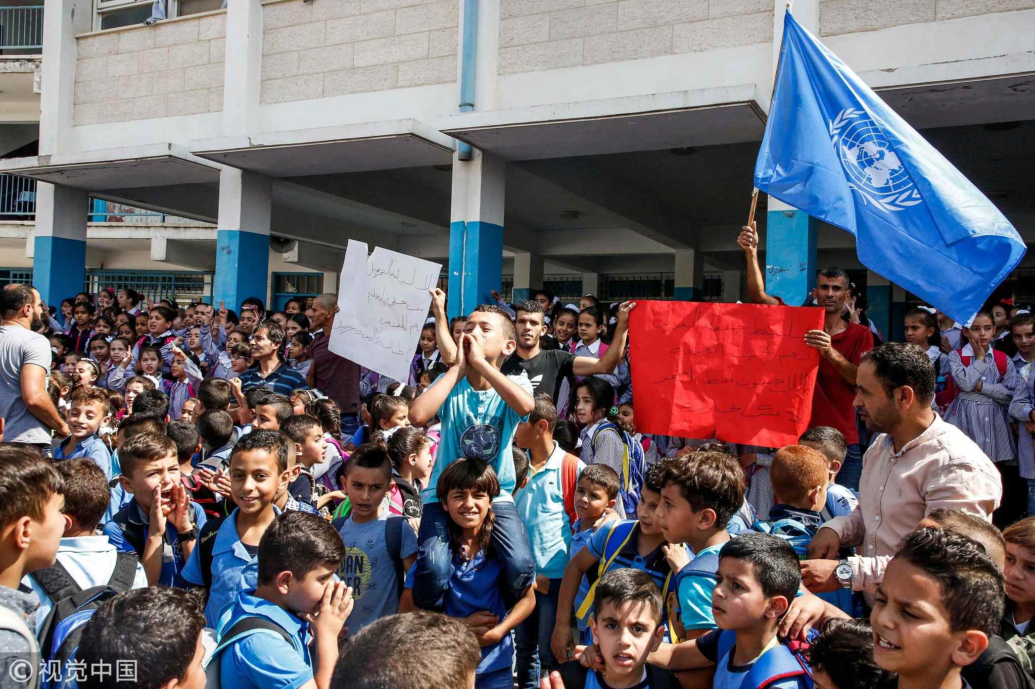 Palestinian children protest at a United Nations Relief and Works Agency (UNRWA) school, financed by US aid, in the Arroub refugee camp near Hebron in the occupied West Bank, September 5, 2018. /VCG Photo