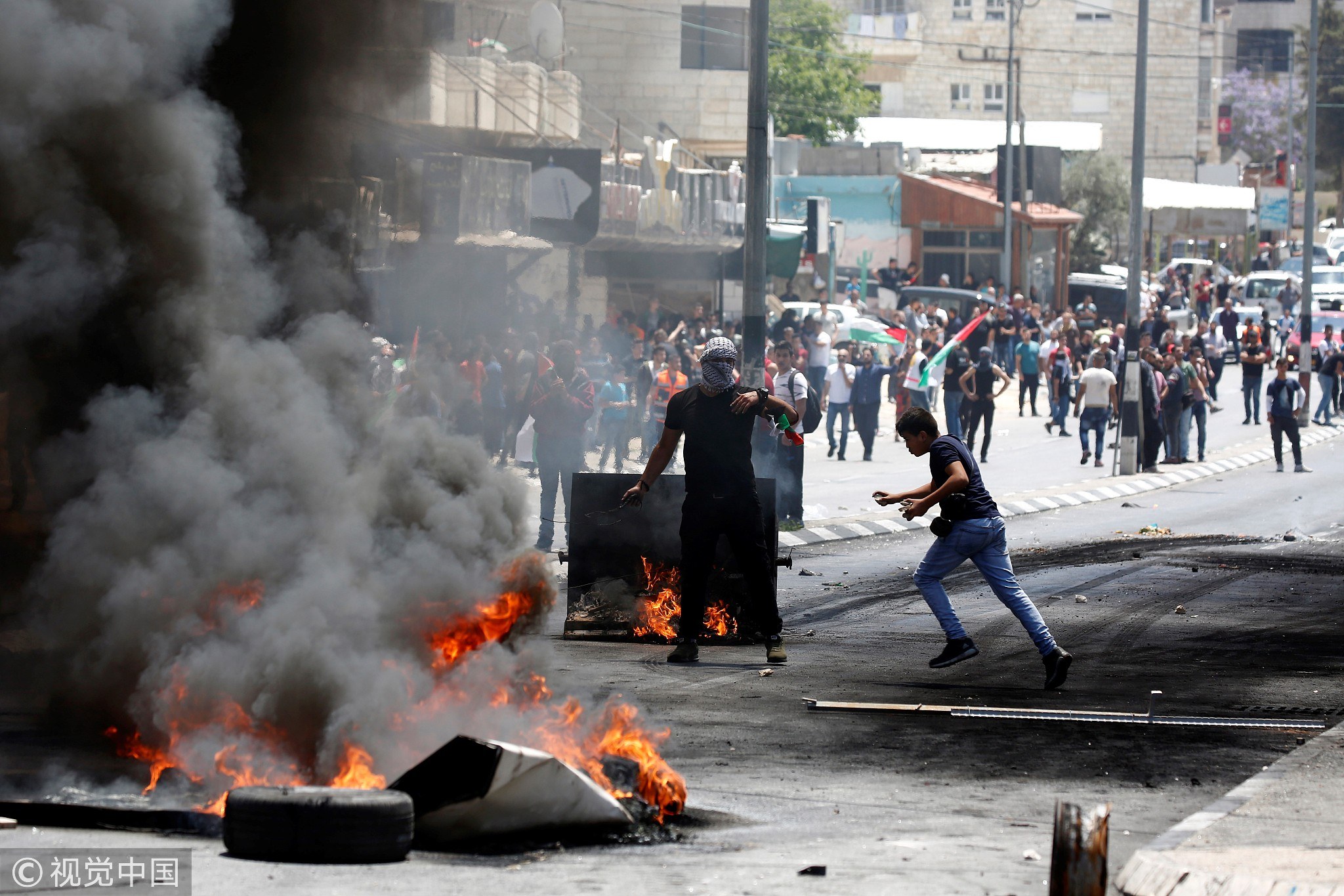 Palestinian protesters burn tires and throw rocks during a protest against US plans to move its embassy, in Bethlehem, West Bank, May 15, 2018. /VCG Photo