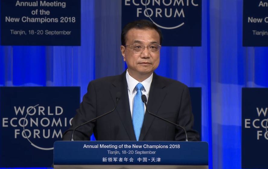 Chinese Premier Li Keqiang speaks at the opening ceremony of the Summer Davos Forum in north China's Tianjin Municipality, September 19, 2018. /CGTN Photo