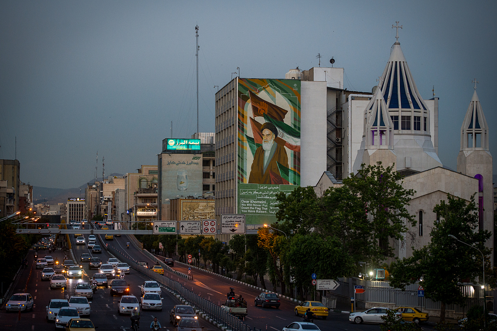 Saint Sarkis Cathedral stands alongside a mural depicting Ruhollah Khomeini, founder of the Islamic Republic of Iran, in Tehran, Iran, May 18, 2019. /VCG Photo
