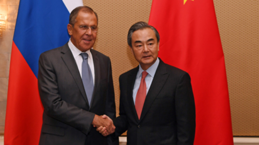China's Foreign Minister Wang Yi (R) and Russia's Foreign Minister Sergei Lavrov shake hands during a meeting, June 3, 2018. /China's MOFA Photo