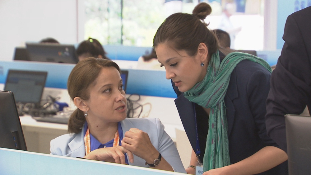 Umarova Yasmina from Uzbekistan talks with an Uzbekistan national media reporter at the media center of the SCO Summit in Qingdao, China, June 10, 2018. /CGTN photo