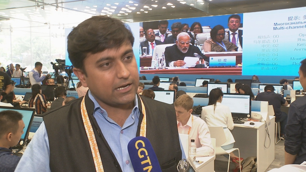 Kumar Gaurav from Asian News International of India is interviewed by CGTN in Qingdao, China, June 10, 2018. /CGTN photo