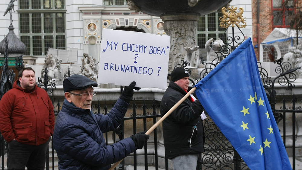 Anti-fascist rally participant with European Union (EU) flag and banner that speaks - You want a Good? Which one? Brown? (in reference to Polish nationalists and Nazi Brownshirts) is seen in Gdansk, Poland, Nov. 19, 2017.