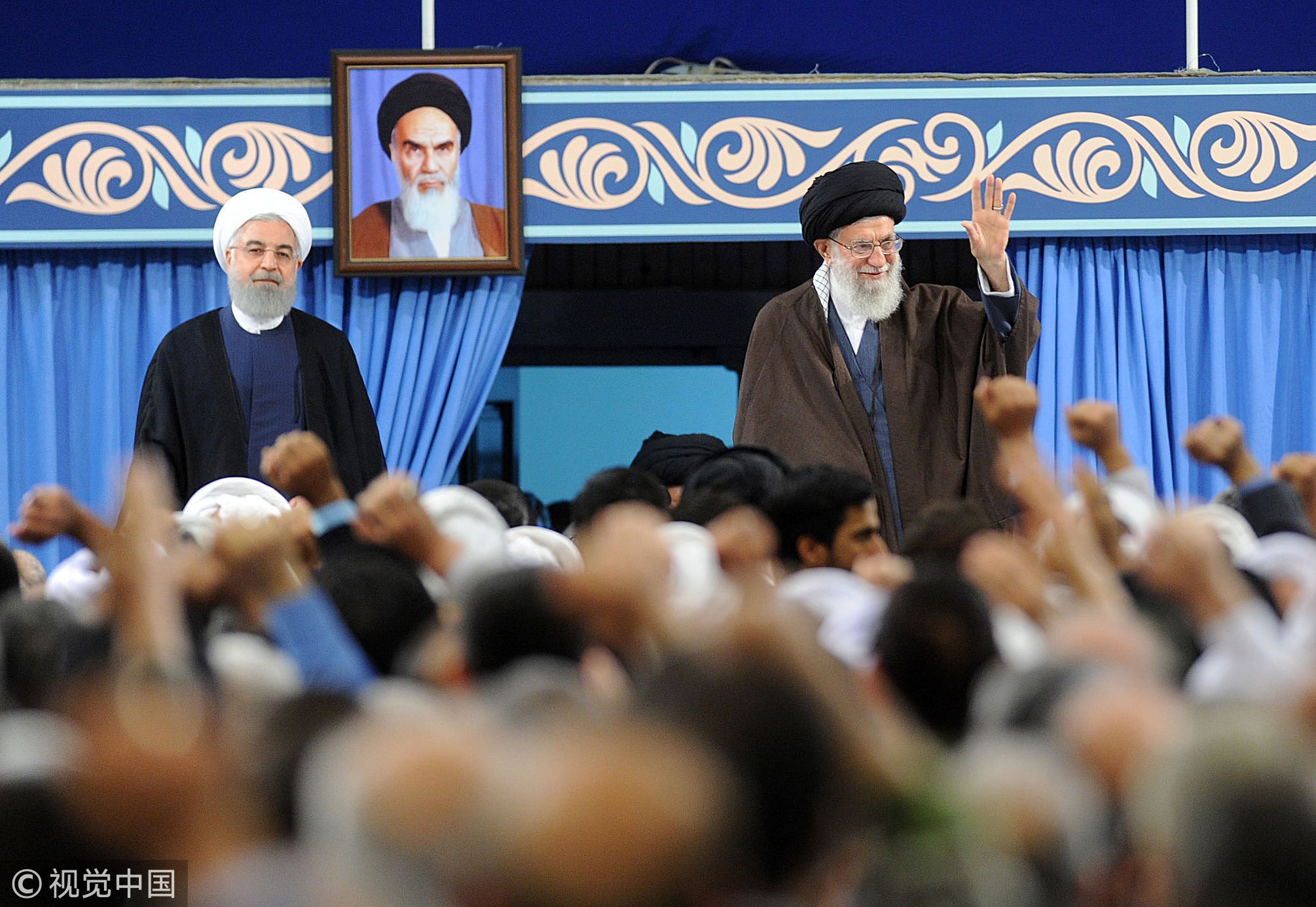 A handout picture provided by the office of Iran's Supreme Leader Ayatollah Ali Khamenei on April 14, 2018, shows him (R) and Iranian President Hasan Rouhani (L) arriving for a ceremony in Tehran. /VCG Photo