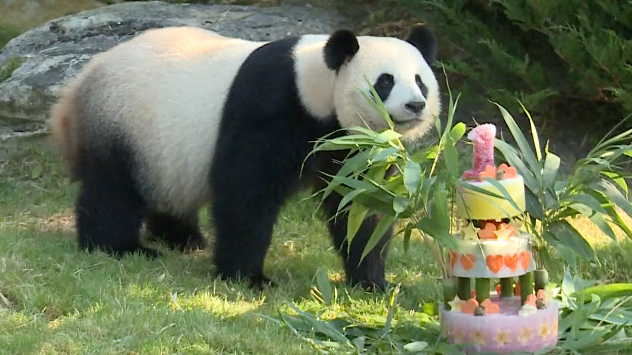 France’s first baby panda celebrated his one-year anniversary Saturday with a birthday cake composed of bamboo, honey, apples, oranges, strawberries and lemons.