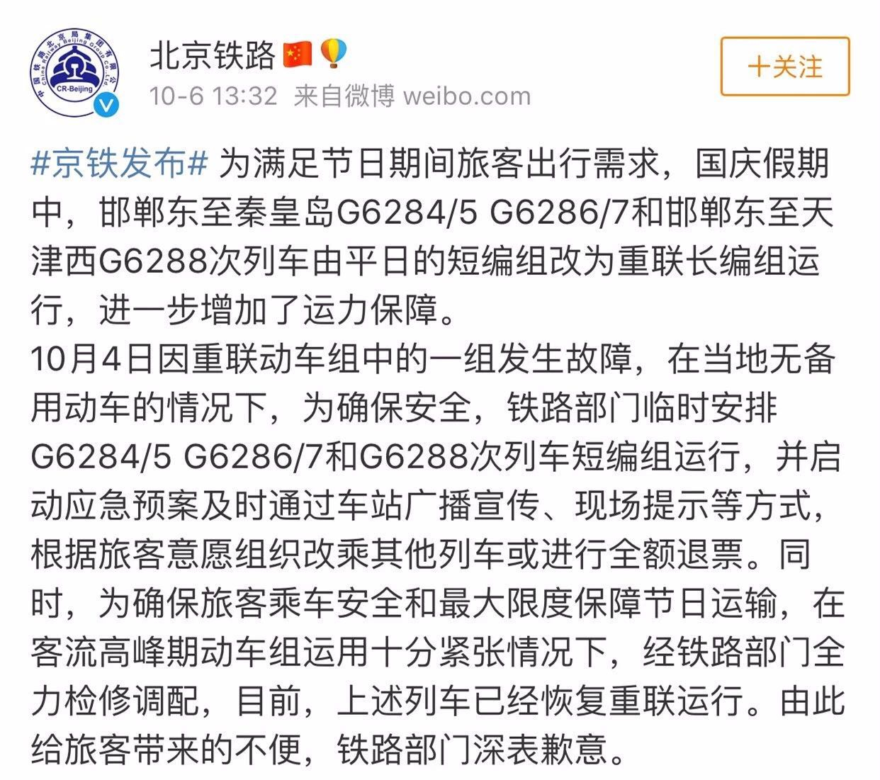 In response, Beijing Railway Bureau on Saturday released a statement on Weibo, apologizing for the inconvenience brought to the passengers. The bureau explained that due to a temporarily mechanical breakdown on Thursday, they launched an emergency plan, replacing the long-formation carriage with the short-formation carriage to ensure safety.