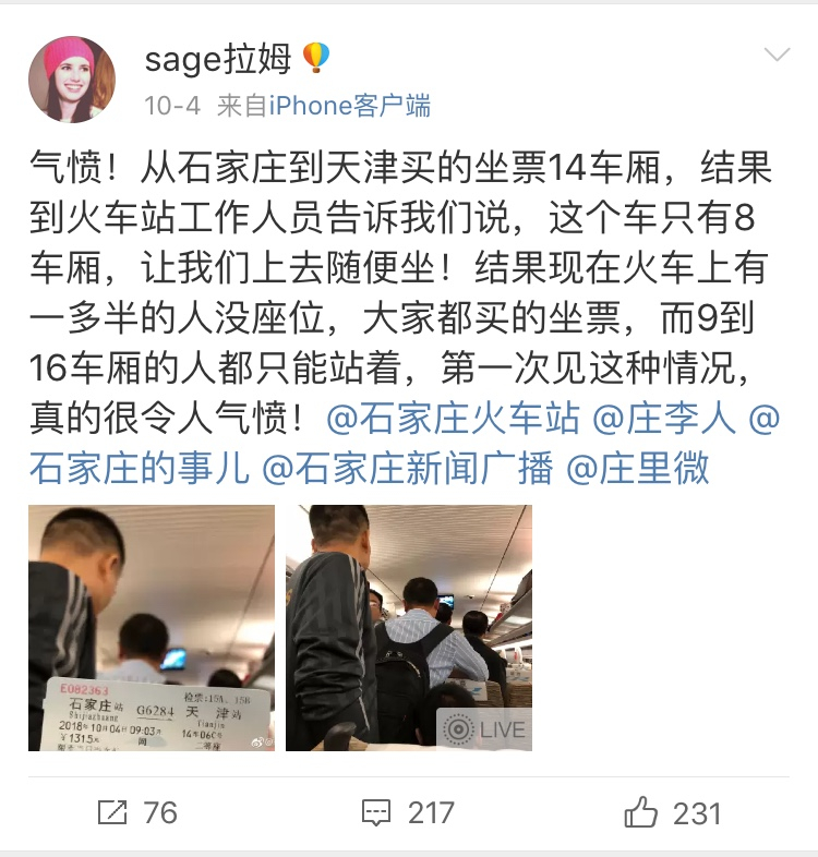 Weibo user @sagelamu complained about the train's "missing" carriages. /Screenshot from Weibo