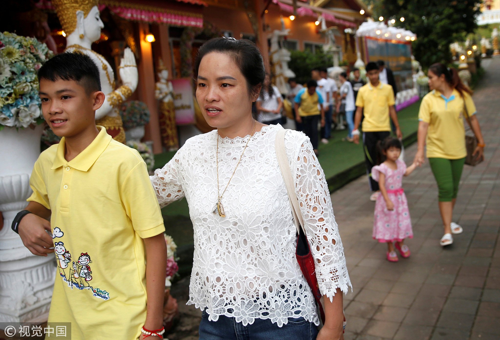 Duangpet Promtep and his family arrive to attend a religious ceremony, in a temple at Mae Sai, in the northern province of Chiang Rai, July 19, 2018. /VCG Photo