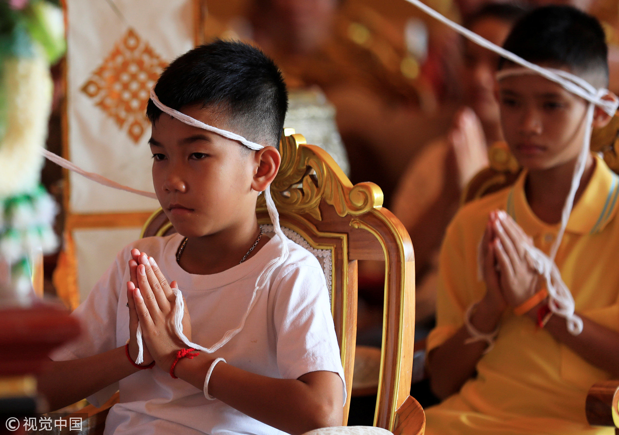 Coach and members of a soccer team rescued from a cave attend a religious ceremony, in a temple at Mae Sai, in the northern province of Chiang Rai, July 19, 2018. /VCG Photo