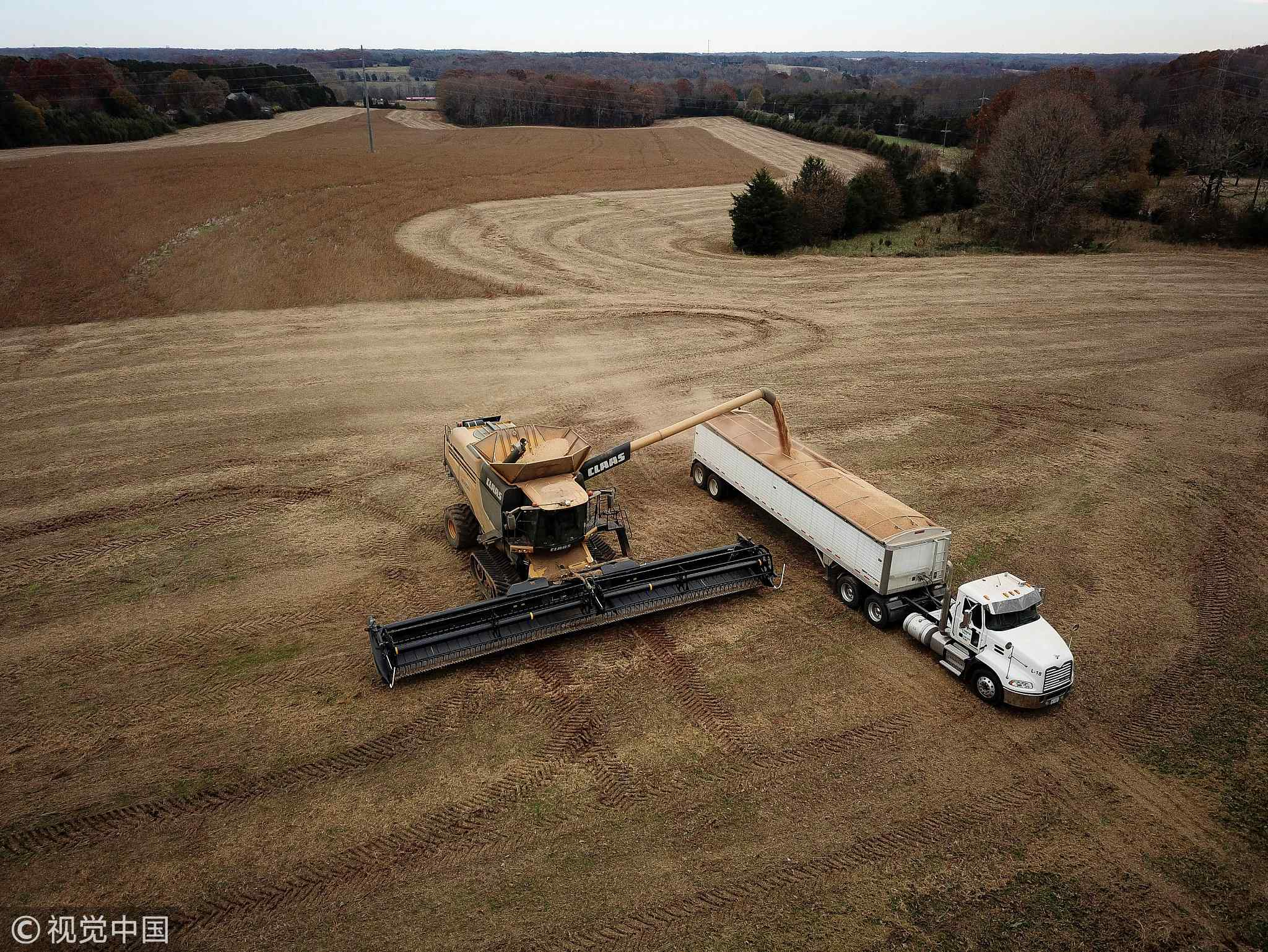 Farmer Lucas Richard of LFR Grain harvests a crop of soybeans at his farm in Hickory, North Carolina, U.S., November 29, 2018. /VCG Photo