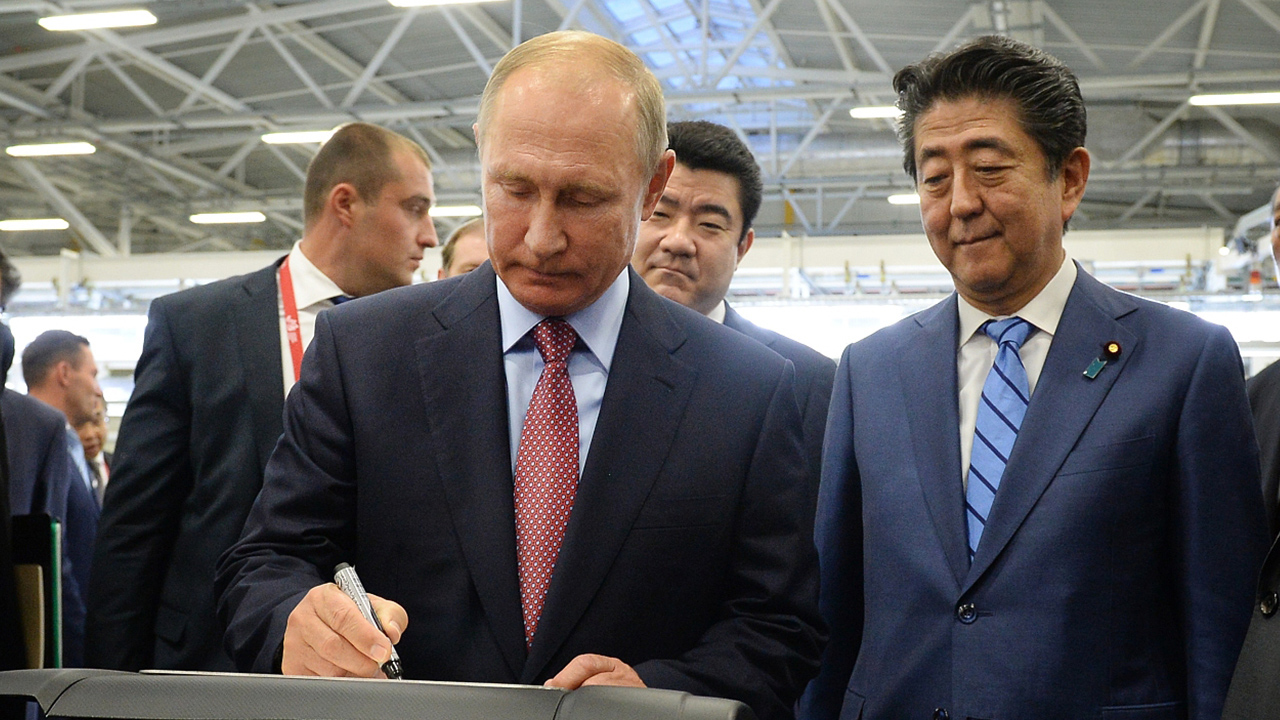 On the sidelines ahead of their bilateral talks at the fourth Eastern Economic forum, Russian President Vladimir Putin and Japanese Prime Minister Shinzo Abe visited the Russian-Japanese joint venture automobile manufacturing complex, Mazda Sollers Manufacturing Rus engine plant, in the far-eastern city of Vladivostok, Russia on Monday. The two leaders attended the launch of an engine assembly line in the plant.