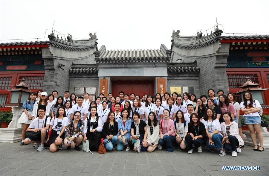 Visitors and volunteers pose for a group photo outside a hospital for conservation in the Palace Museum in Beijing, capital of China, June 9, 2018. /Xinhua