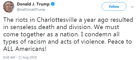 On Saturday, Trump tweeted the "riots" in Charlottesville "resulted in senseless death and division. We must come together as a nation. I condemn all types of racism and acts of violence. Peace to ALL Americans!"