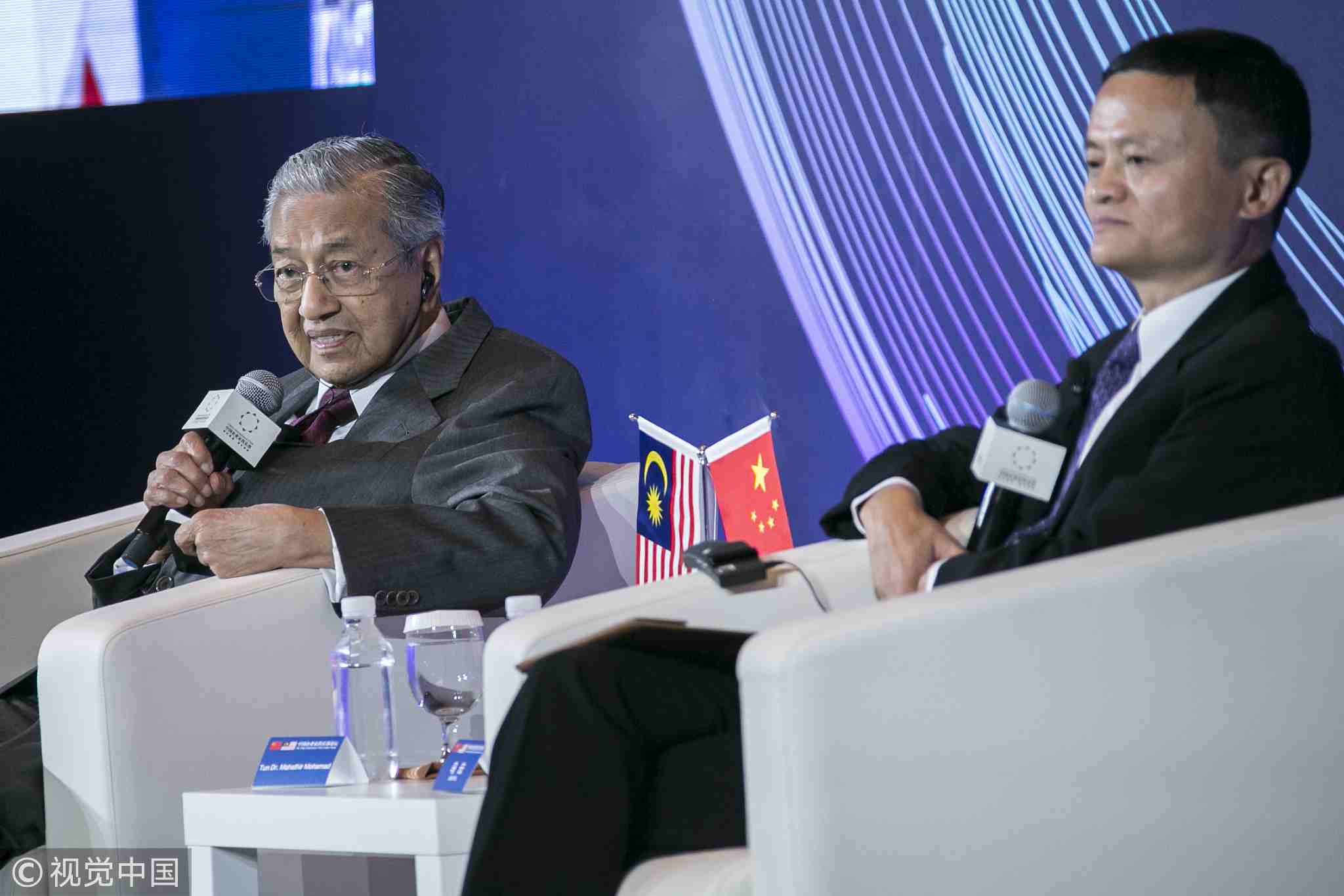 Malaysian Prime Minister Mahathir Mohamad with Ma Yun, the co-founder and executive chairman of Alibaba Group at Hangzhou, Zhejiang Province. /VCG Photo