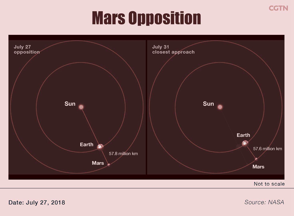 The red planet will show up brighter when it is in its opposition point, and for this year, the closest approach will take place on July 31, with the closest distance between Mars and Earth of about 57.6 million kilometers. It is the nearest position of Mars to Earth after 15 years, while 2003 still keeps the record for being the year that Mars was at the closest point to Earth in nearly 60,000 years. The distance was about 55.8 million kilometers.