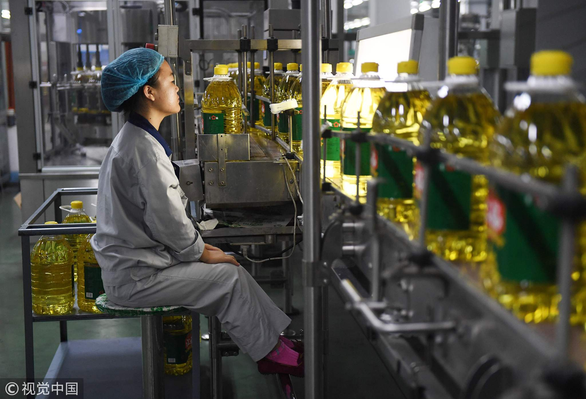 A worker monitoring a soybean oil production line at the Hopeful Grain and Oil Group factory in Sanhe, China on July 19. /VCG Photo