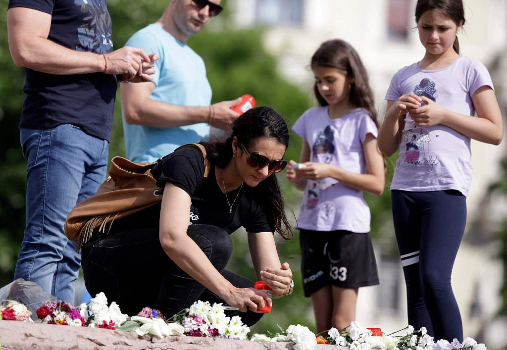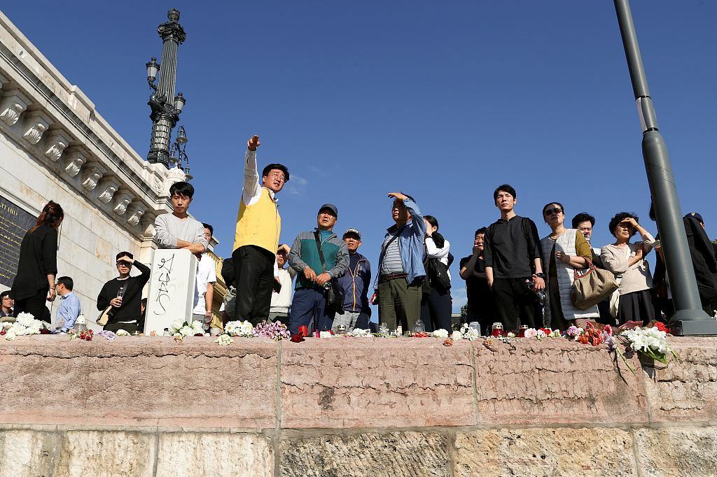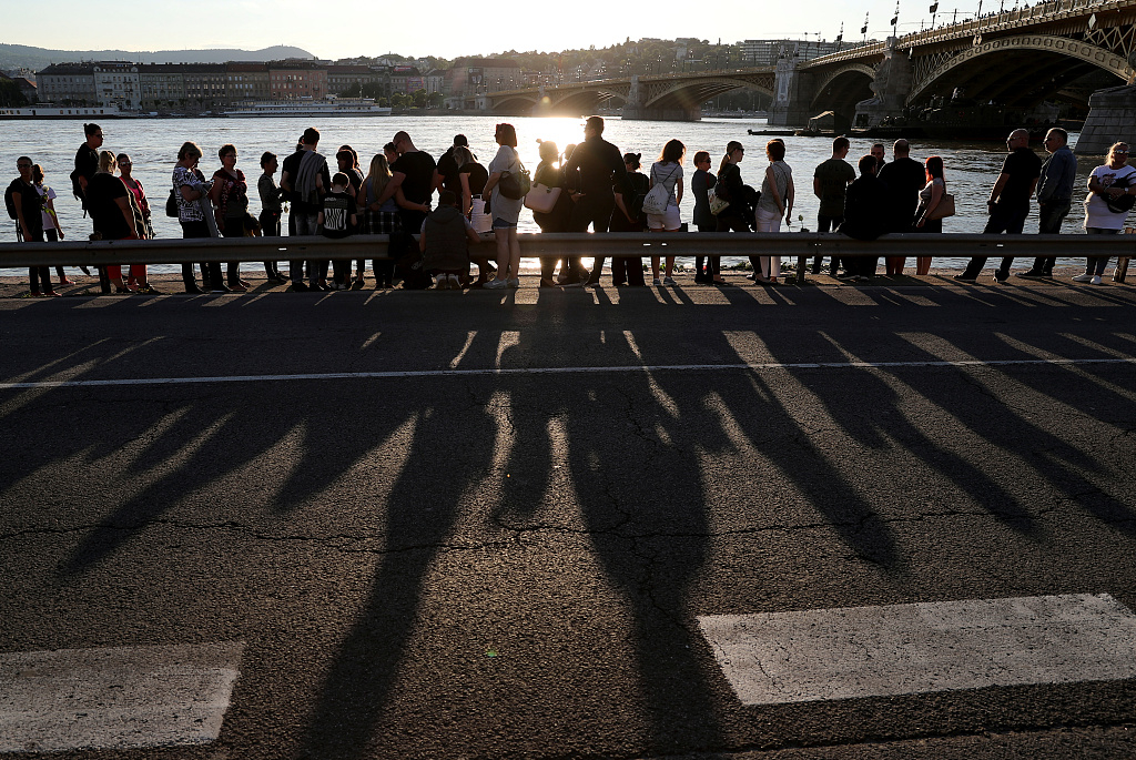 People gathered at the river Danube at the site where a river cruise collided with a smaller sightseeing vessel, which left seven South Korean tourists dead and 21 still missing on June 1, 2019, in Budapest, Hungary. /VCG Photo