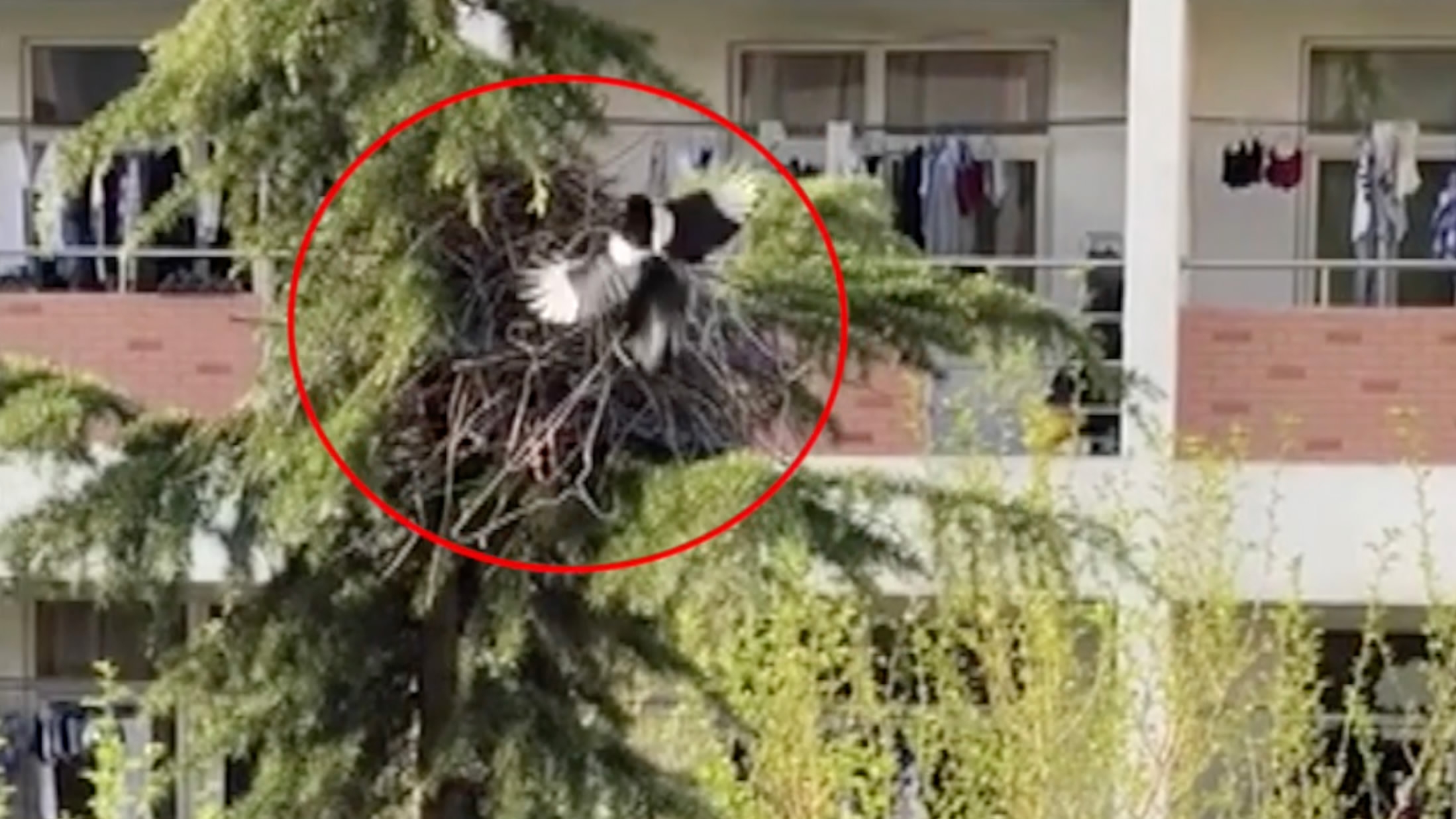 In Qingdao, east China's Shandong Province, a magpie took coat hangers from a university dorm balcony to build a metal nest. A student left more than a dozen coat hangers dangling on his dorm balcony but, when he returned, only three remained – then he saw the rest of his hangers on a tree outside the dorm.