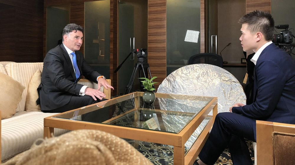 Umberto de Pretto [L], Secretary General of IRU speaks with CGTN reporter in Dalian.