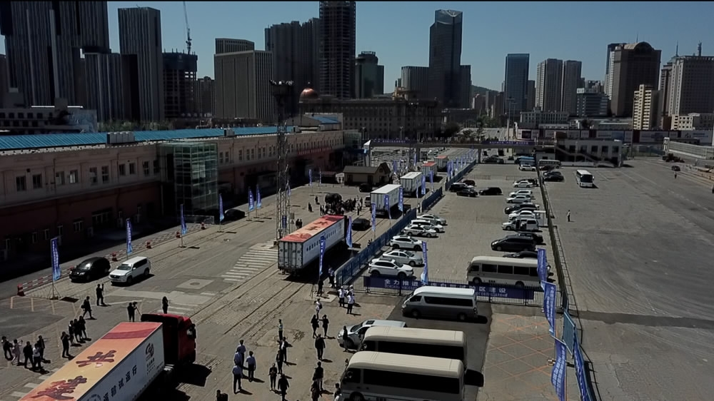 The first batch of trucks drive off from Dalian towards Novosibirsk./CGTN Photo