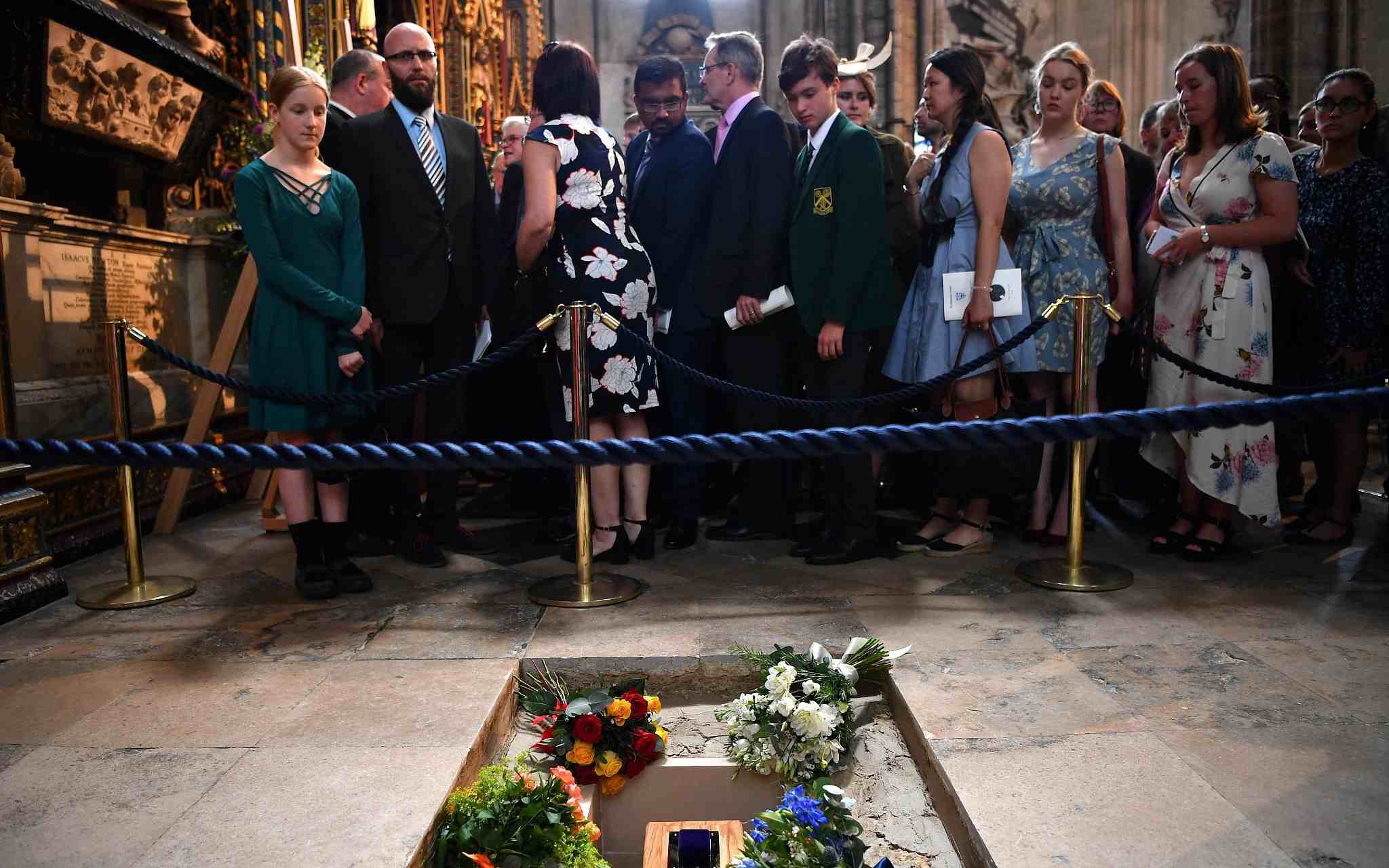Members of the congregation file past the ashes of British scientist Stephen Hawking at the site of their internment in the nave of the Abbey church, during a memorial service at Westminster Abbey, in central London on June 15, 2018. /VCG Photo