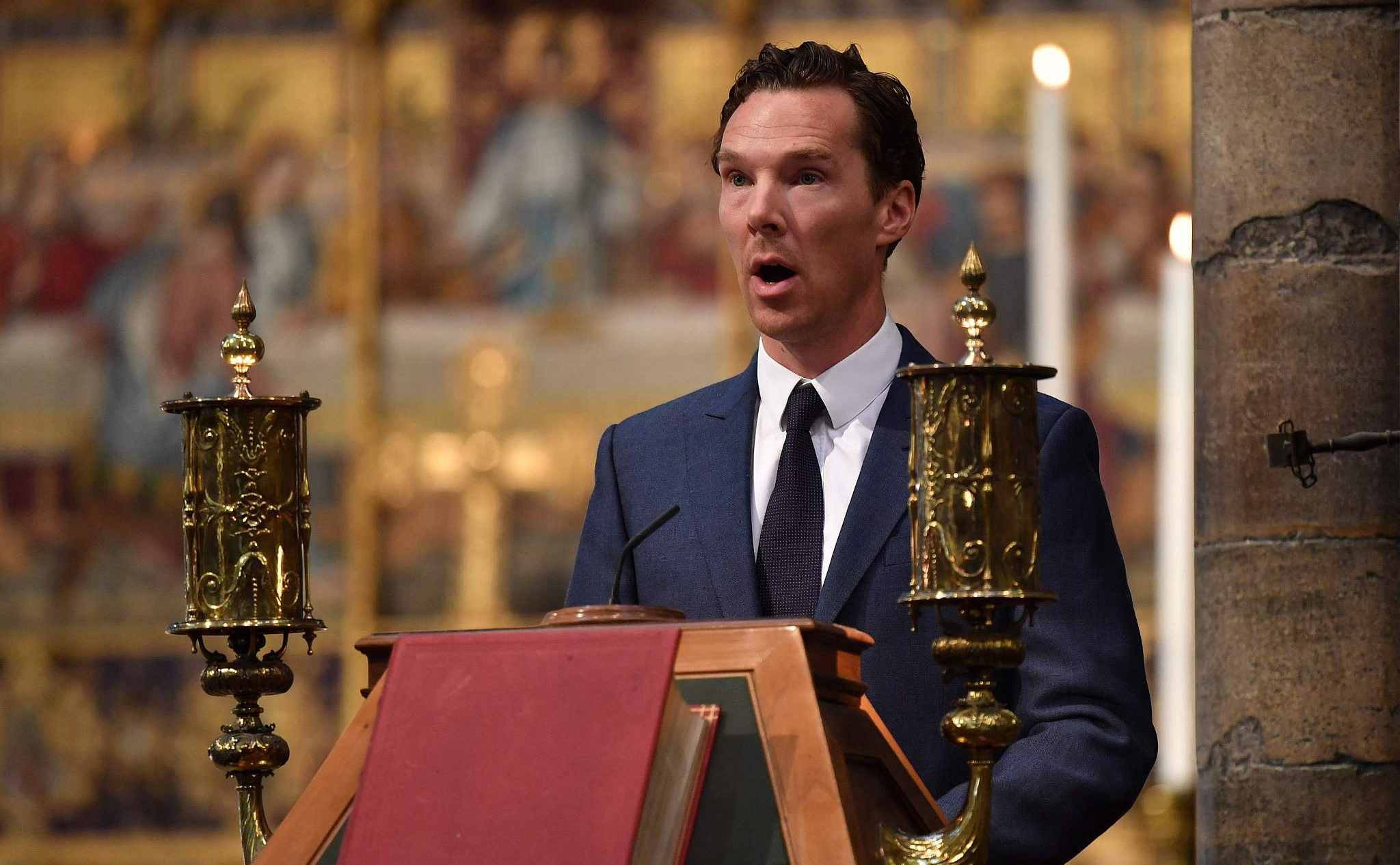 British actor, Benedict Cumberbatch speaks at a memorial service for British scientist Stephen Hawking during which his ashes will be buried in the nave of the Abbey church, at Westminster Abbey, in central London on June 15, 2018. /VCG Photo