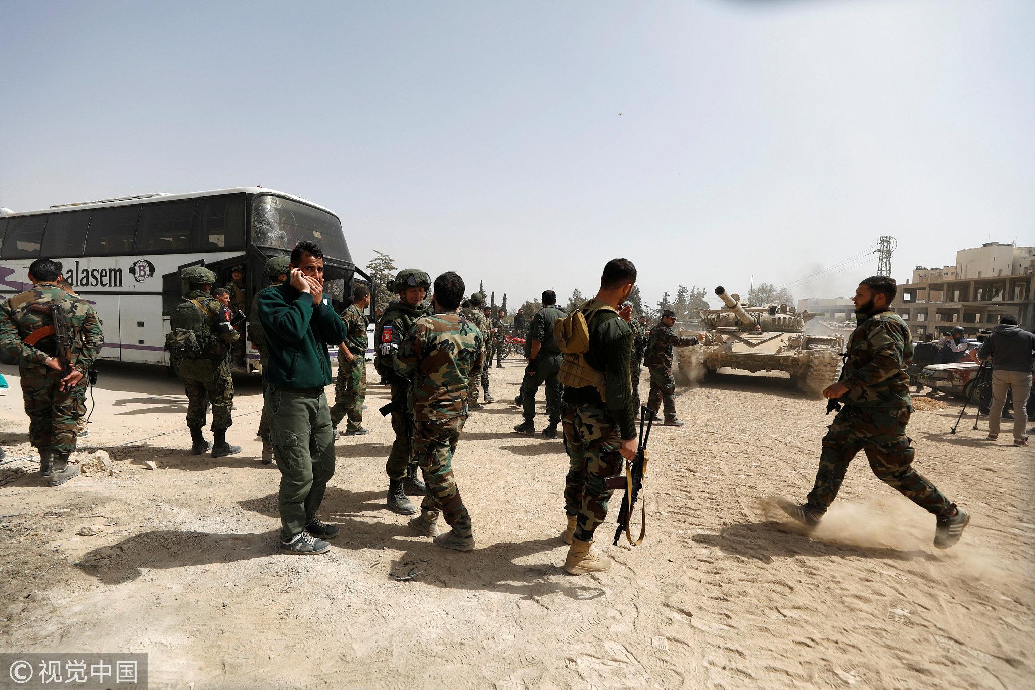 Syrian army soldiers are seen at the entrance of Harasta, in the eastern Damascus suburb of Ghouta, Syria, March 22, 2018. /VCG Photo