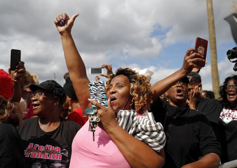 Sheila Williams, center, raises her arm and sings with others standing outside New Bethel Baptist Church as a viewing for Aretha Franklin is held inside, Thursday, Aug. 30, 2018, in Detroit. /AP Photo
