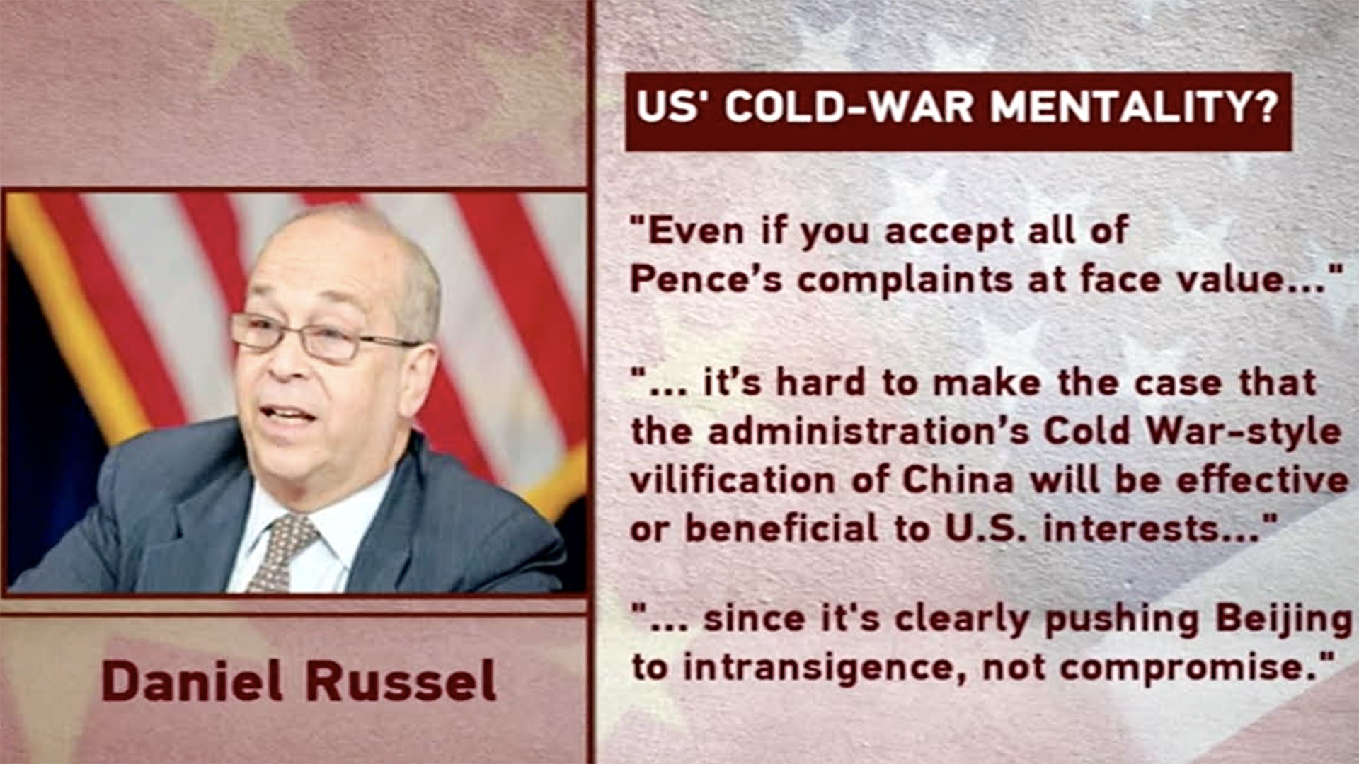 Mike Pence's speech appears to reflect a Cold War mentality, and uses baseless allegations coupled with fictional charges as its dominant themes. Daniel Russel, who served as Washington's top diplomat for East Asia until 2017, said that it’s hard to make the case that the administration’s Cold War-style vilification of China will be effective or beneficial to US interests, "since it's clearly pushing Beijing to intransigence, not compromise."