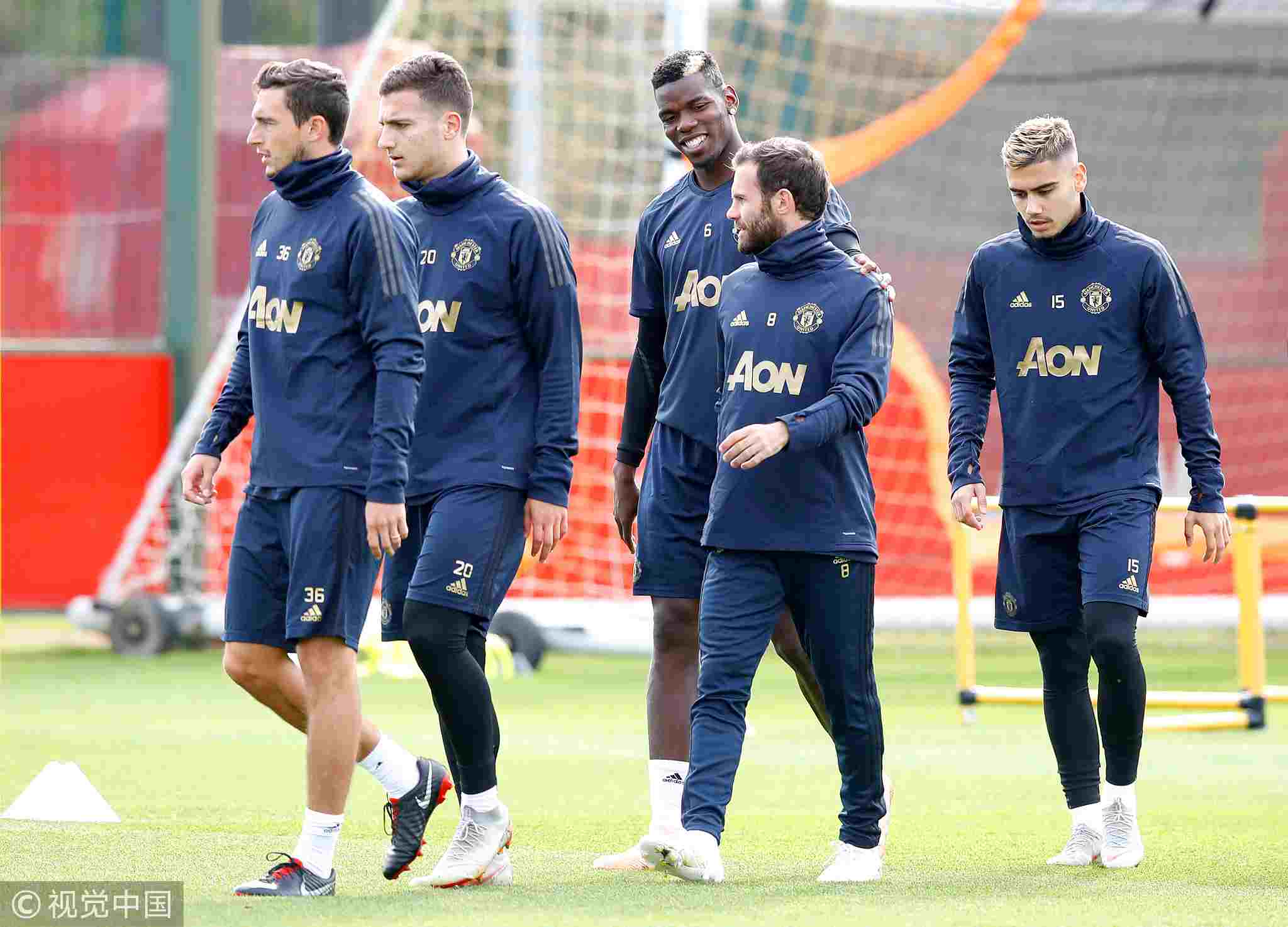 Manchester United's Paul Pogba (C) and Manchester United's Juan Mata (2nd R) during a first team training session at Aon Training Complex in Manchester, England, October 1, 2018. /VCG Photo