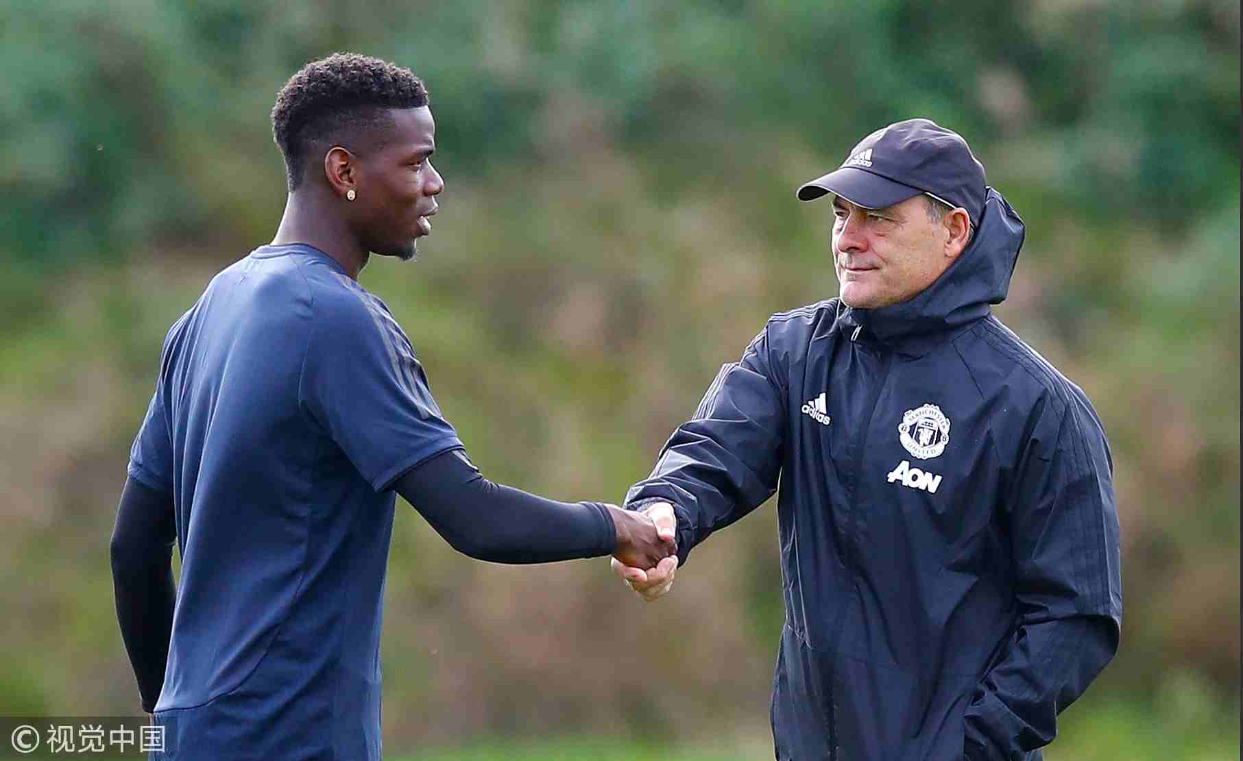 Manchester United's Paul Pogba (L) shakes hands with Manchester United Assistant Coach Silvino Louro during a first team training session at Aon Training Complex in Manchester, England, October 1, 2018. /VCG Photo