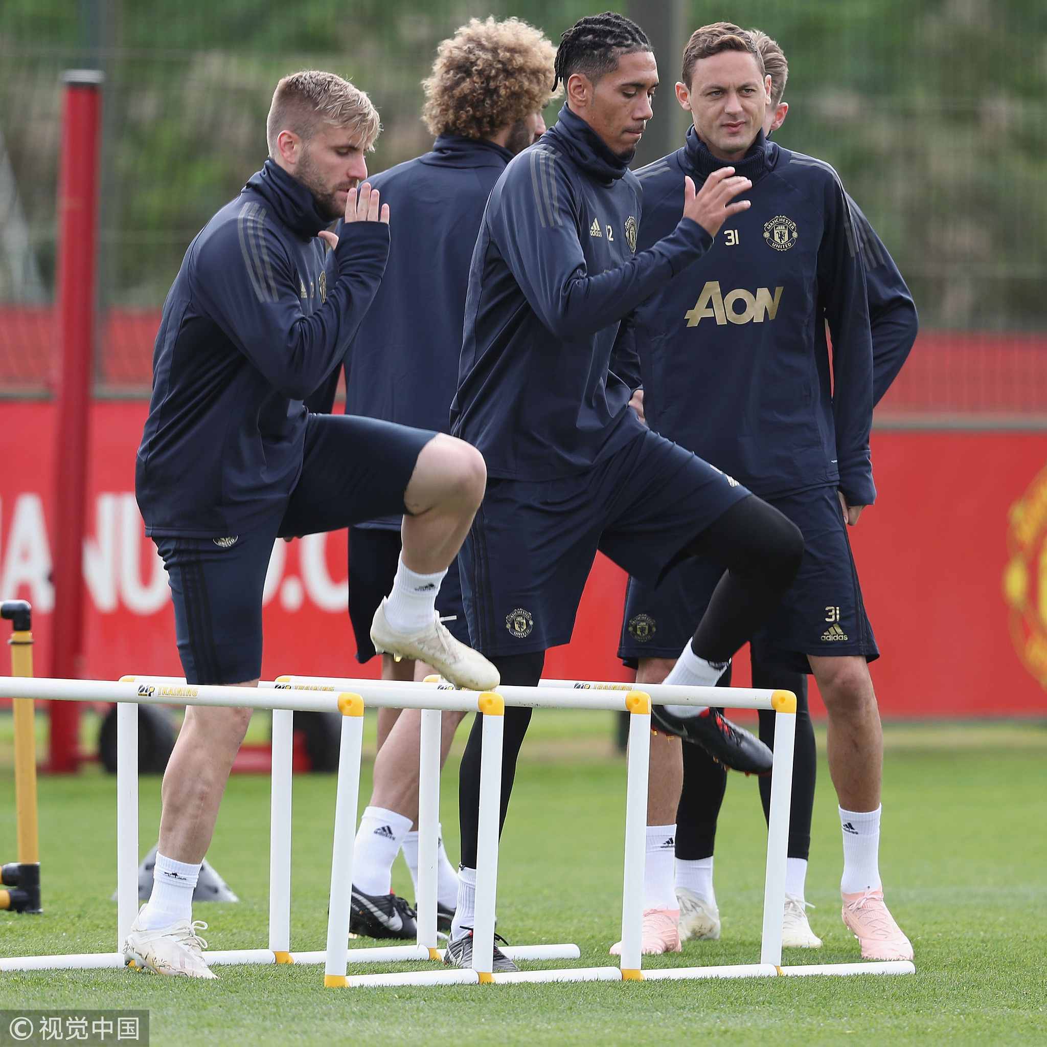 Luke Shaw (L) and Chris Smalling (R) of Manchester United in action during a first team training session at Aon Training Complex in Manchester, England, October 1, 2018. /VCG Photo