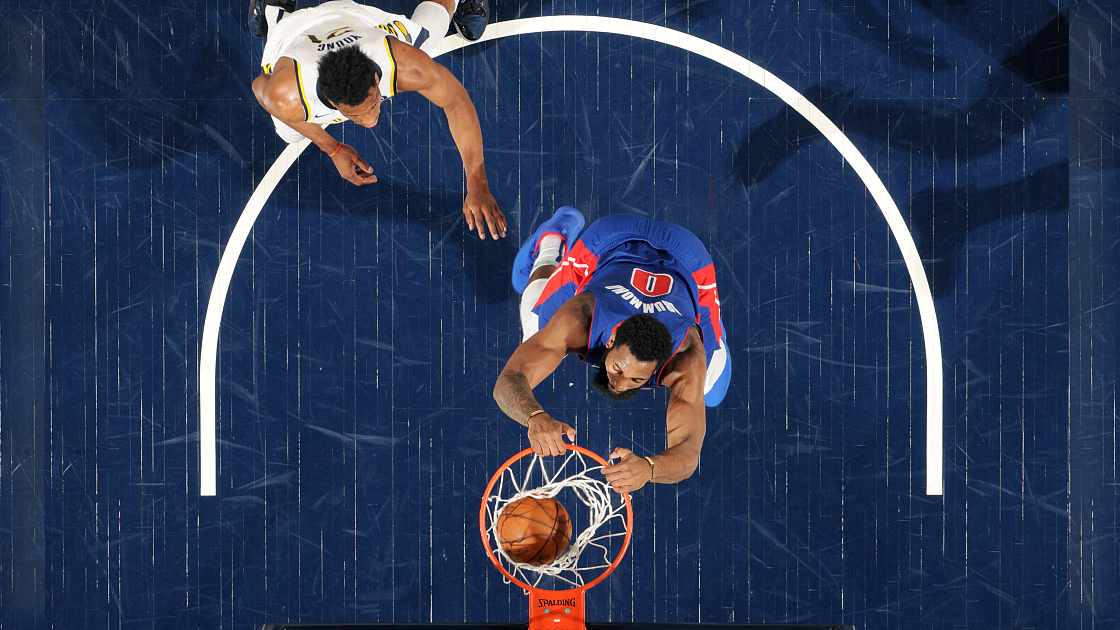 Andre Drummond #0 of the Detroit Pistons executes a dunk against the Indiana Pacers at Bankers Life Fieldhouse in Indianapolis, Indiana on April 1, 2019. /VCG Photo