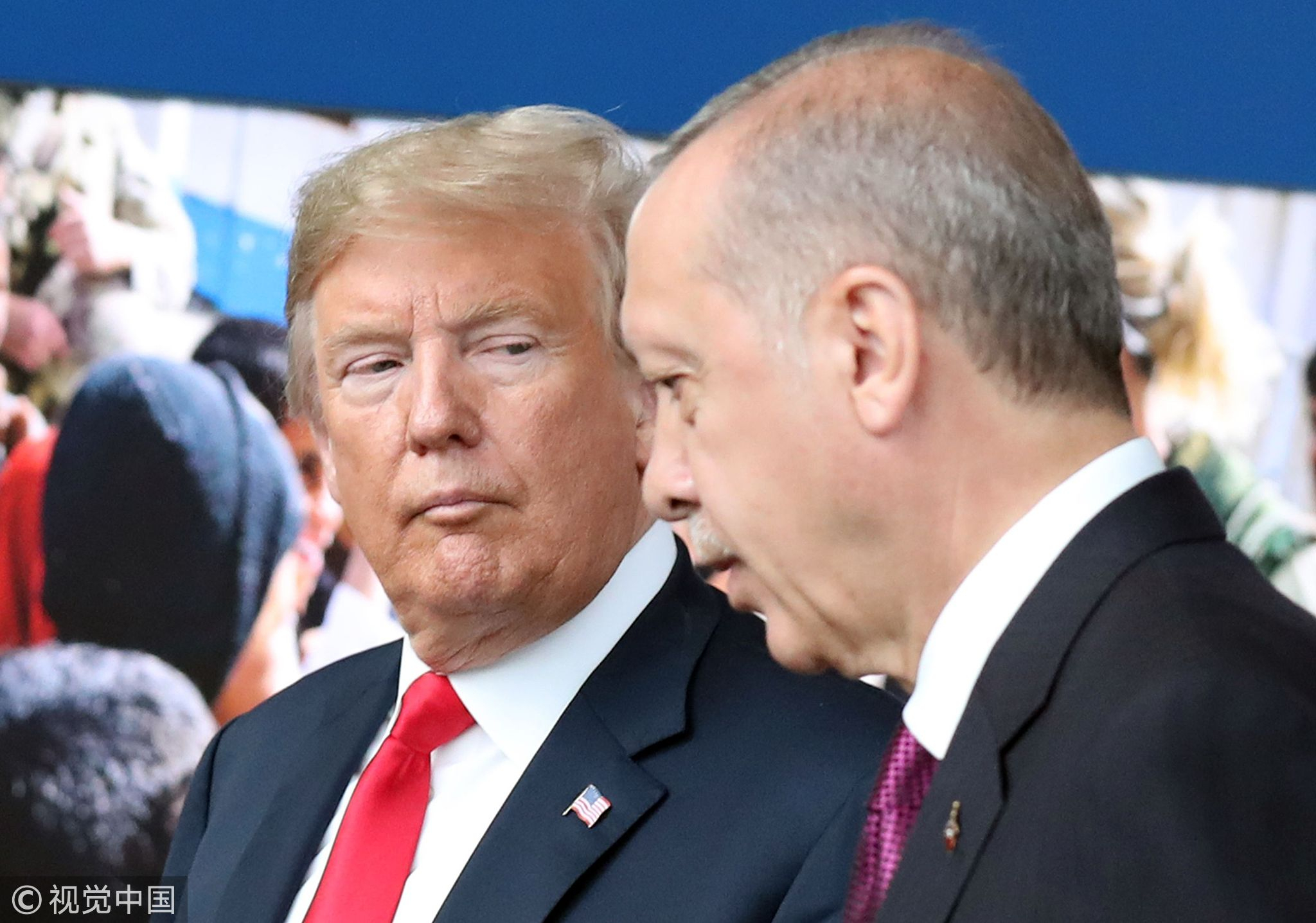 US President Donald Trump (L) talks to Turkey’s President Recep Tayyip Erdogan (R) as they arrive for the NATO summit at the NATO headquarters in Brussels, July 11, 2018./ VCG Photo
