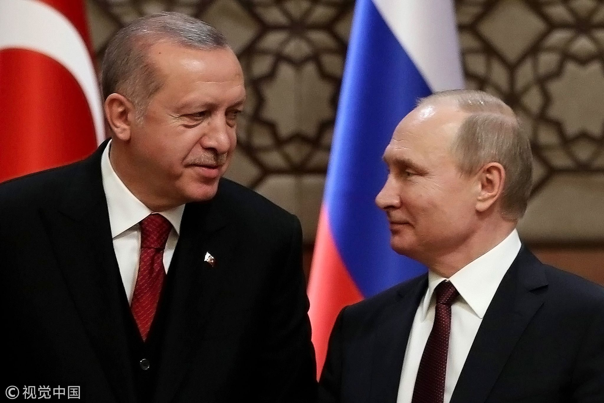 Turkey's President Recep Tayyip Erdogan (L) and Russia's President Vladimir Putin look at each other during a joint press conference with the Iranian president, as part of a tripartite summit on Syria, in Ankara, April 04, 2018./ VCG Photo